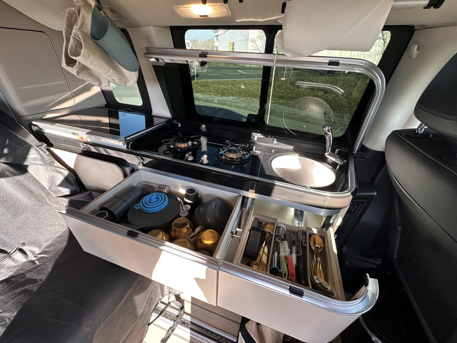 Hlad je najväčší nepriateľ. Šporák s dvoma horákmi znamená iba jedno, varenie dvoch jedál súčasne nie je žiaden problém. Príprava čerstvých ale hlavne teplých pokrmov je na cestách dôležitá. Plynová bomba je schovaná v zadnej časti auta pod jednou z mnohých skriniek.